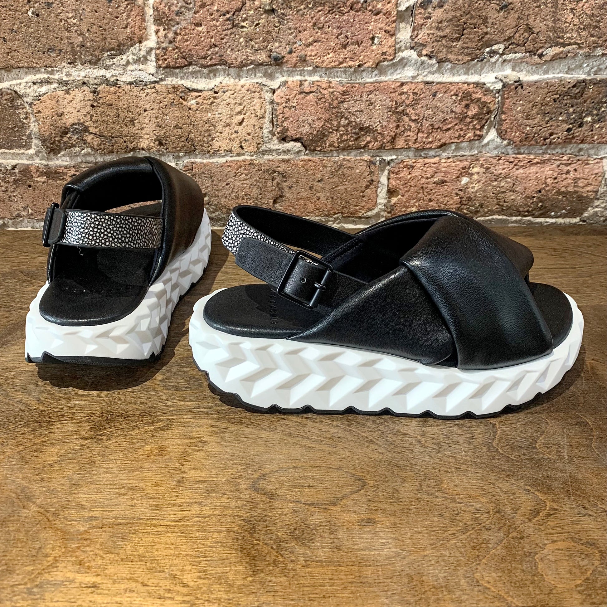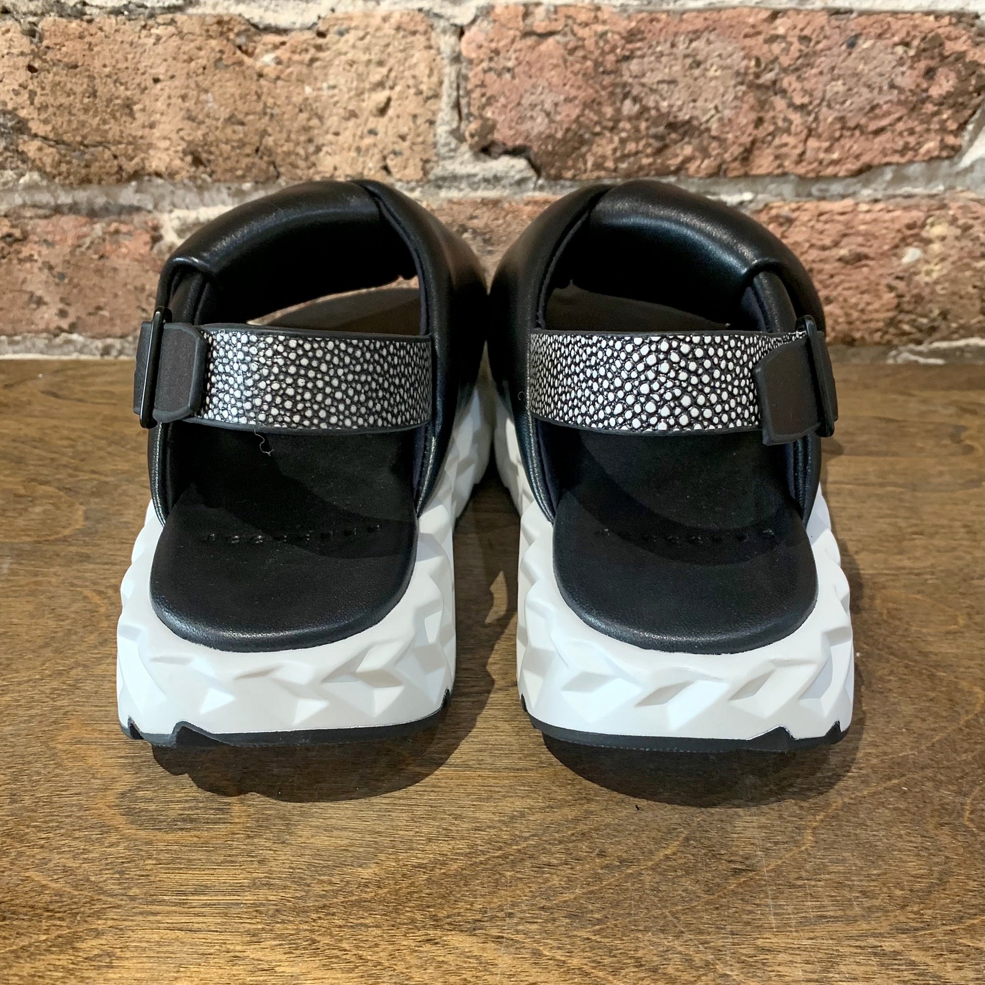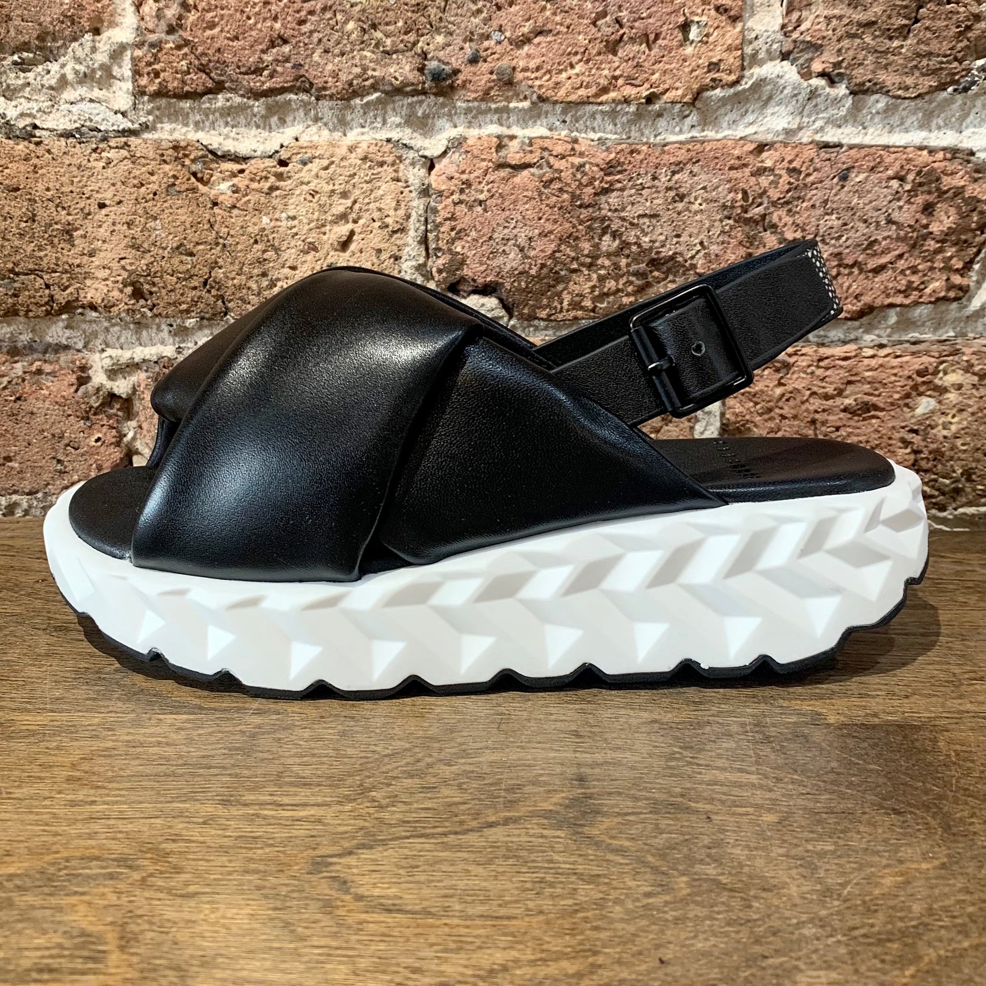Jabara Coil is a slingback sandal crafted in beautiful black sheep leather resting on a sporty cushioned outsole. The puffy knotted upper & the contrast of white sole brings a chic allure to the overall design.