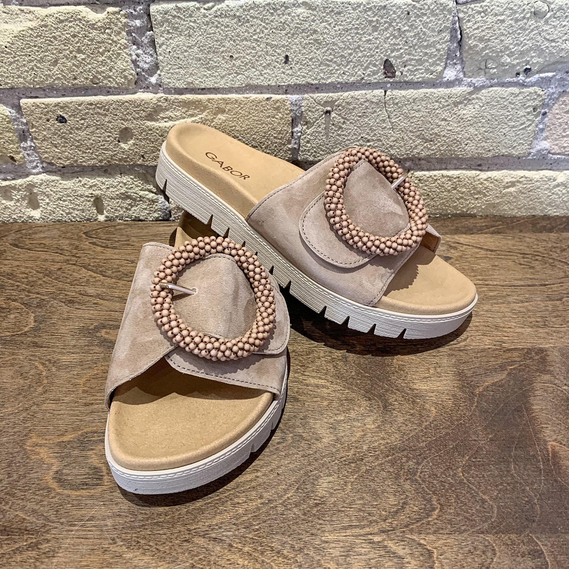 A Gabor classic in the world of slides, this model shines with its unique color combinations and unbeatable comfort. The matching buckle adds a stylish touch, making these shoes an absolute must-have.