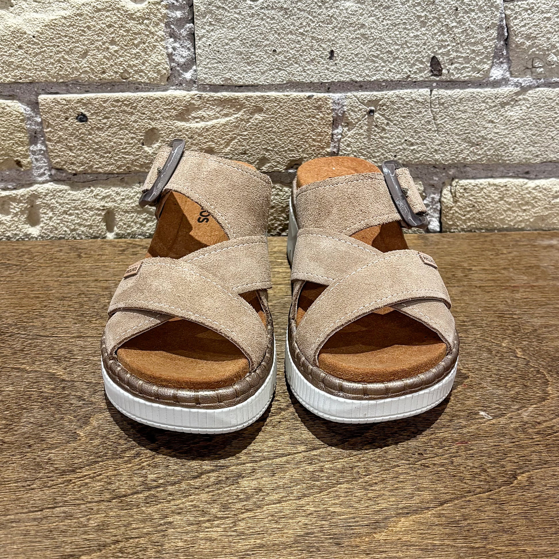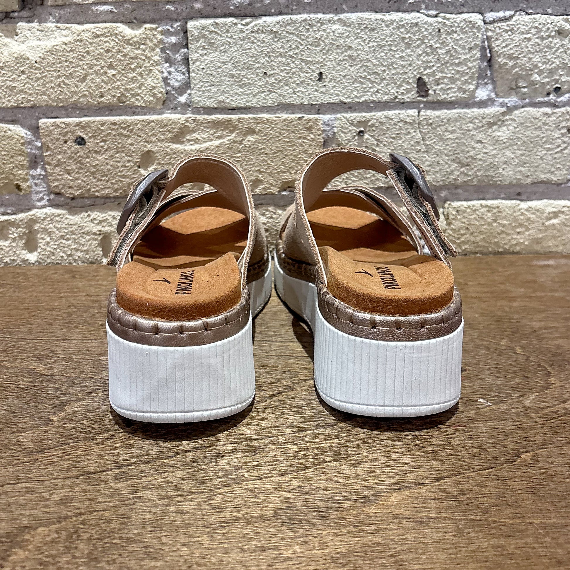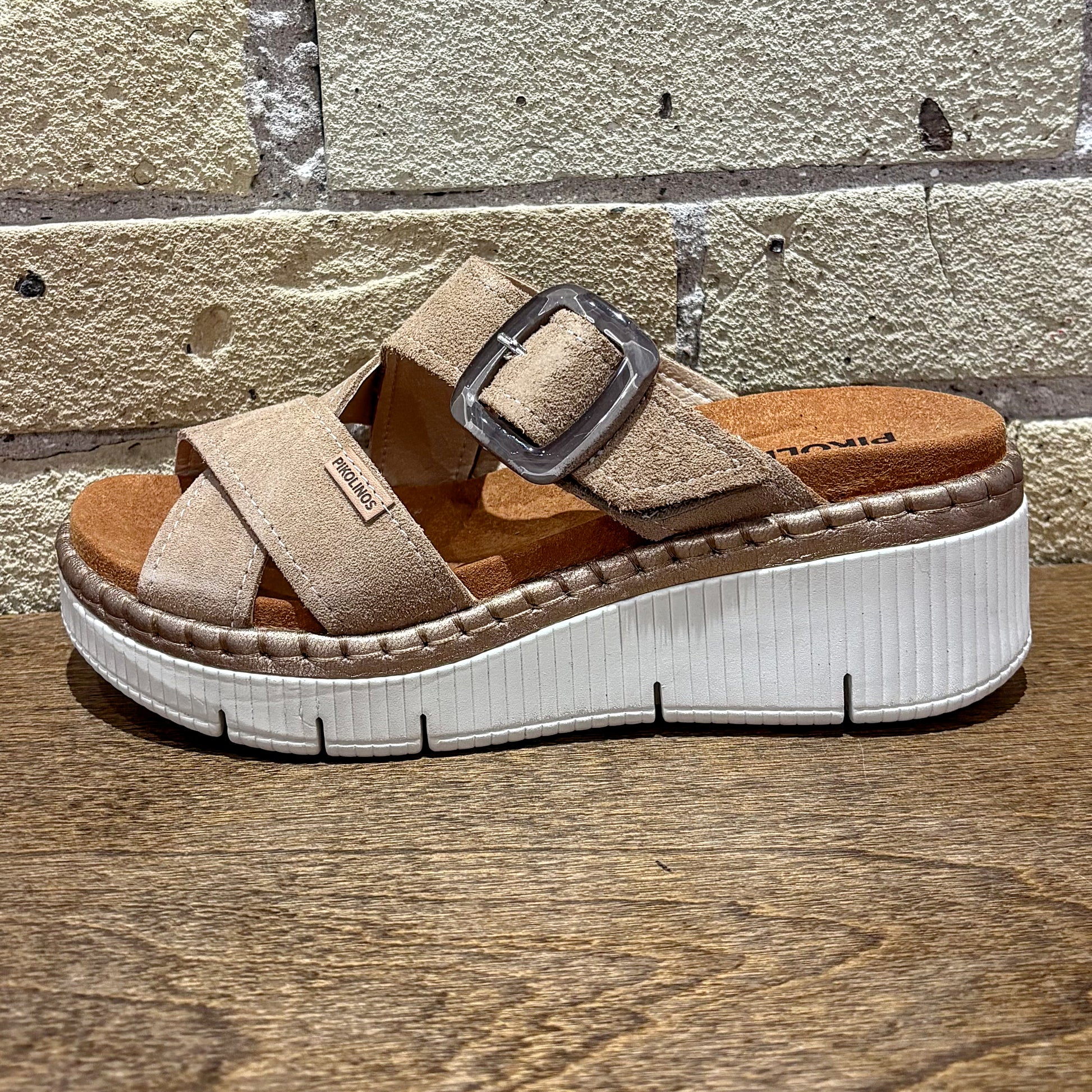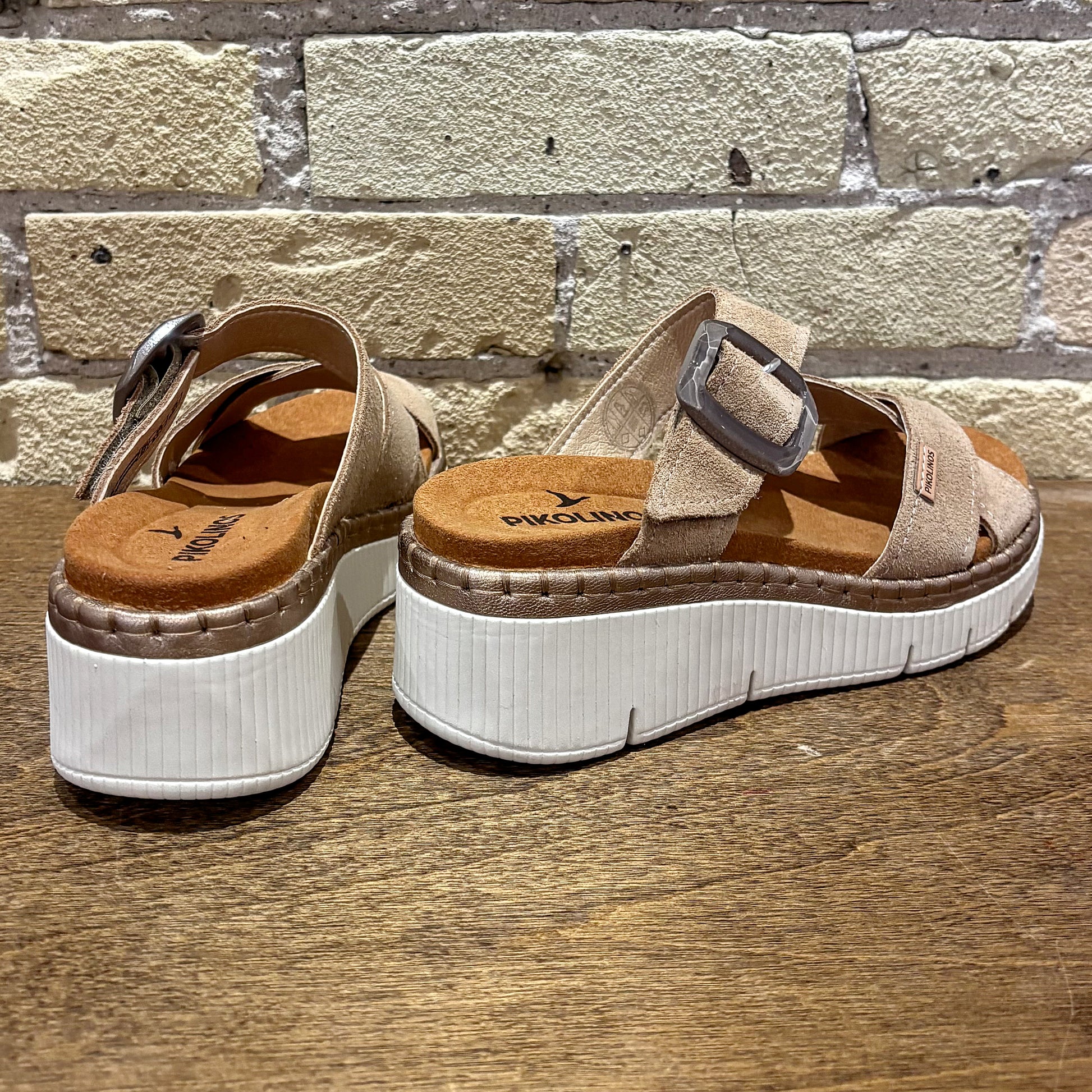 Enjoy summer in style and comfort in Pikolinos Gomera wedge sandal in desert. With a height of 6 cm, their lightweight design and ultra-light sole will accompany you with every step, making walking a pleasure. The cushioned insole offers comfort, while the buckle closure ensures a perfect fit. Perfect for sunny days, they are the ideal complement to your freshest and most versatile looks. M